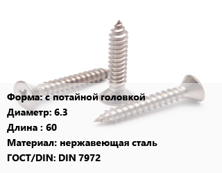Саморез с потайной головкой D=6.3 L=60 нержавеющая сталь ГОСТ: DIN 7972