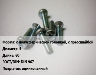 Винт с полусферической головкой, с прессшайбой 5х60 DIN 967 оцинкованный, 4.8, цена за шт, кг цена от 3.06 Тг / кг, где купить, условия доставки в Нур-Султане и Акмолинской области