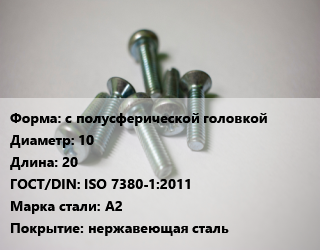 Винт с полусферической головкой 10х20 ISO 7380-1:2011 Сталь: A2 нержавеющая сталь, цена за шт, кг цена от 79.2 Тг / кг, где купить, условия доставки в Нур-Султане и Акмолинской области